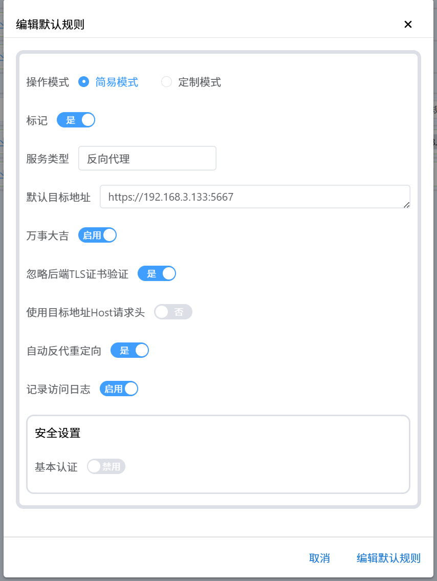 默认规则我划给了飞牛的主界面,即https://127.0.0.1:5667,可以根据自己实际需求设置。其他设置按照图中示例即可。注意必须是反向代理类型