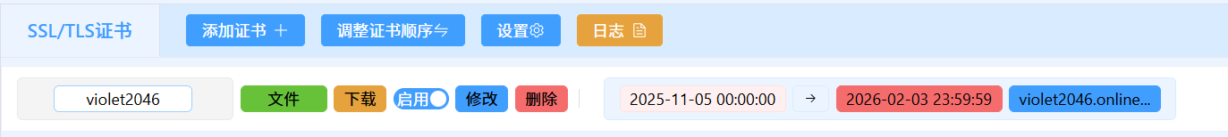 若需通过公网 HTTPS 访问,请提前将你的 SSL 证书(如 violet2046.online)上传至 Lucky。稍后在web规则中lucky会自动调用这些证书,属于必填项。看到这个界面就说明上传成功了: