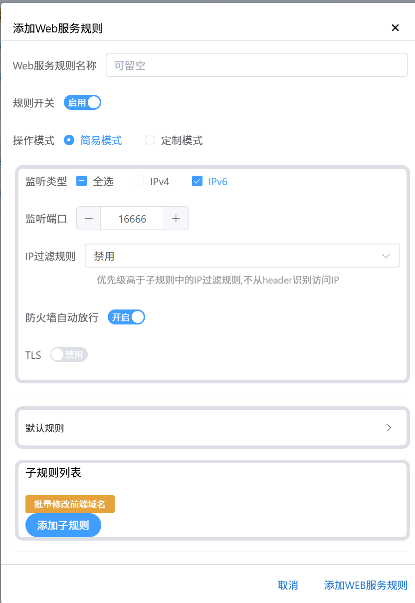 点击新建规则,监听端口选择你frp设置的端口,我这里以5668做示范,记得使用https的话需要打开tls,否则无法进行加密。