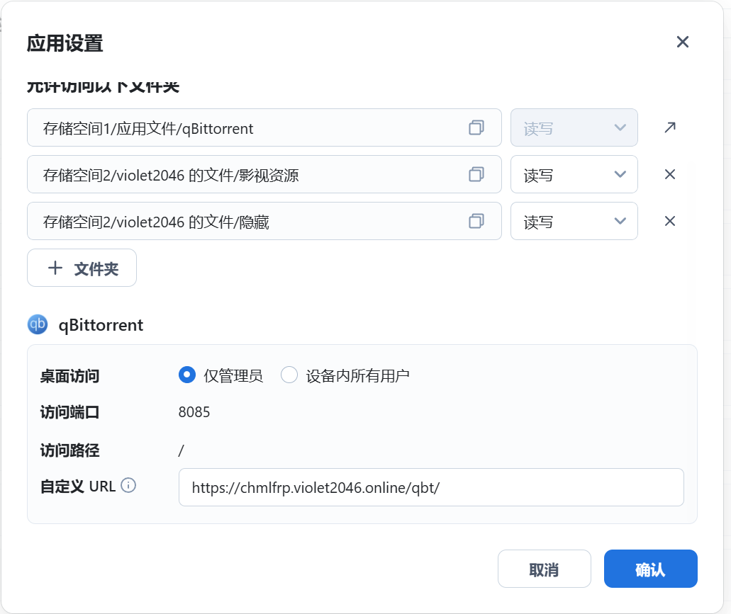 在应用管理中配置 qBittorrent 外部访问链接