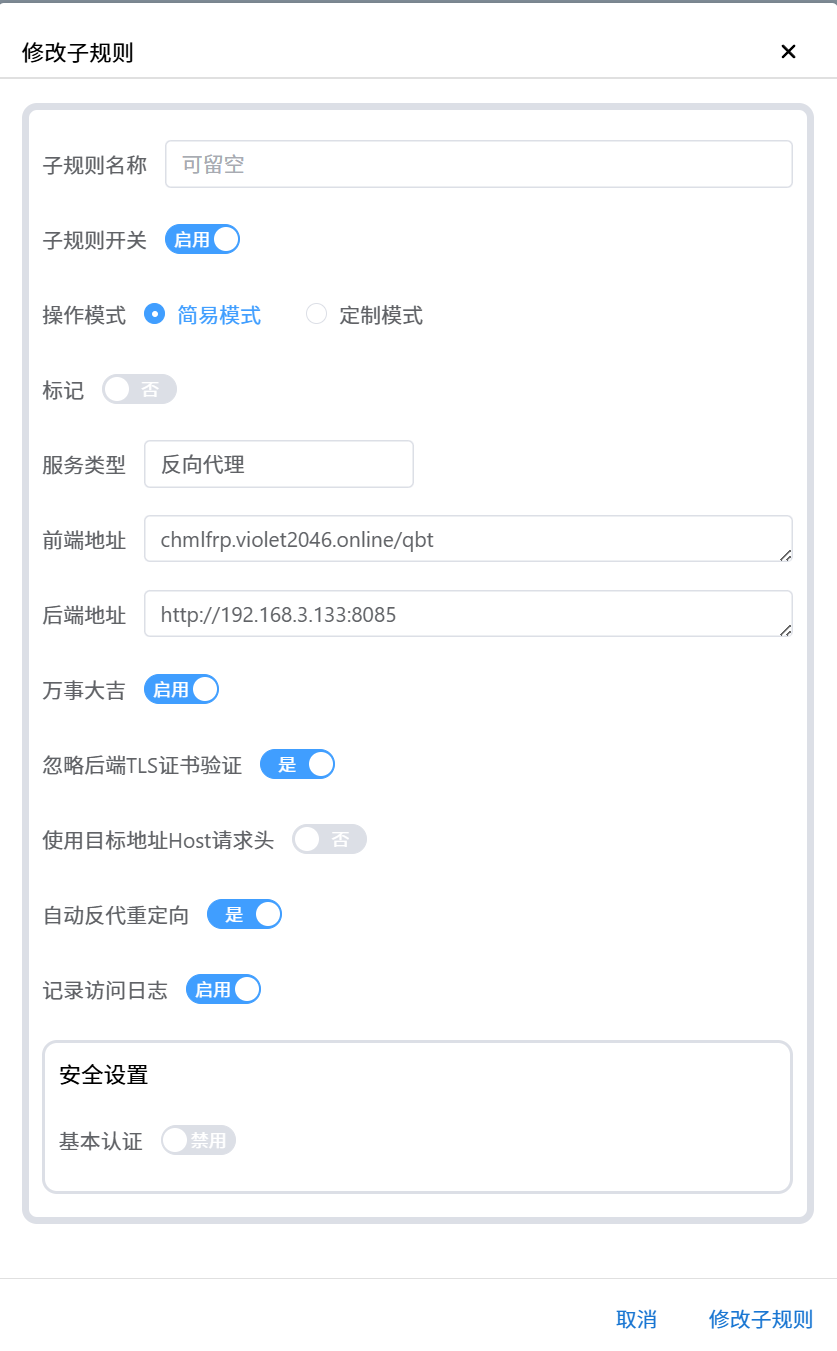 然后新建子规则,把前端地址写上你的域名+/qbt/,我这里就不写了。后端填本地ip:8085,按照你的实际服务端口写,同样服务类型需要设置为反向代理