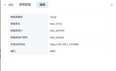 进到了1panel的控制面板,在这里我们可以看到有应用商店字样,点击并进入,搜索“halo”并安装即可,端口选择你frp映射的端口,ip输本地域名,如果没有安装mysql数据库的话点击“前往安装“按照指引即可我这里mysql的安装均设置为默认参数。网址我这里以填写本地域名或服务器内网 IP(如 192.168.3.133)为例子,其他参数默认,即可创建一个halo应用。